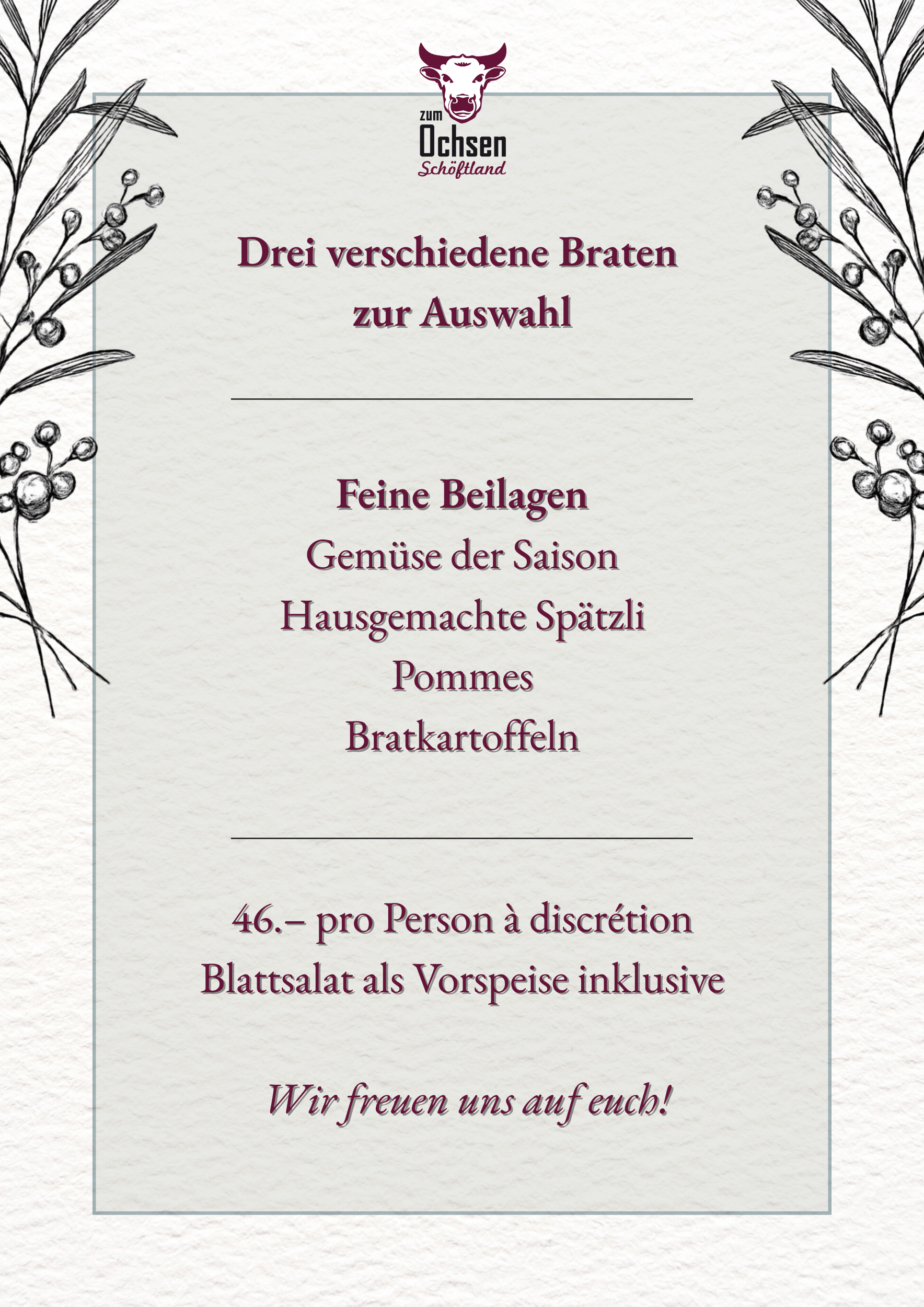 Braten-Sonntag Sonntag, 1. März 2026 11:30 Sonntag, 29. März 2026 17:30 Google Kalender ICS RESERVIEREN
