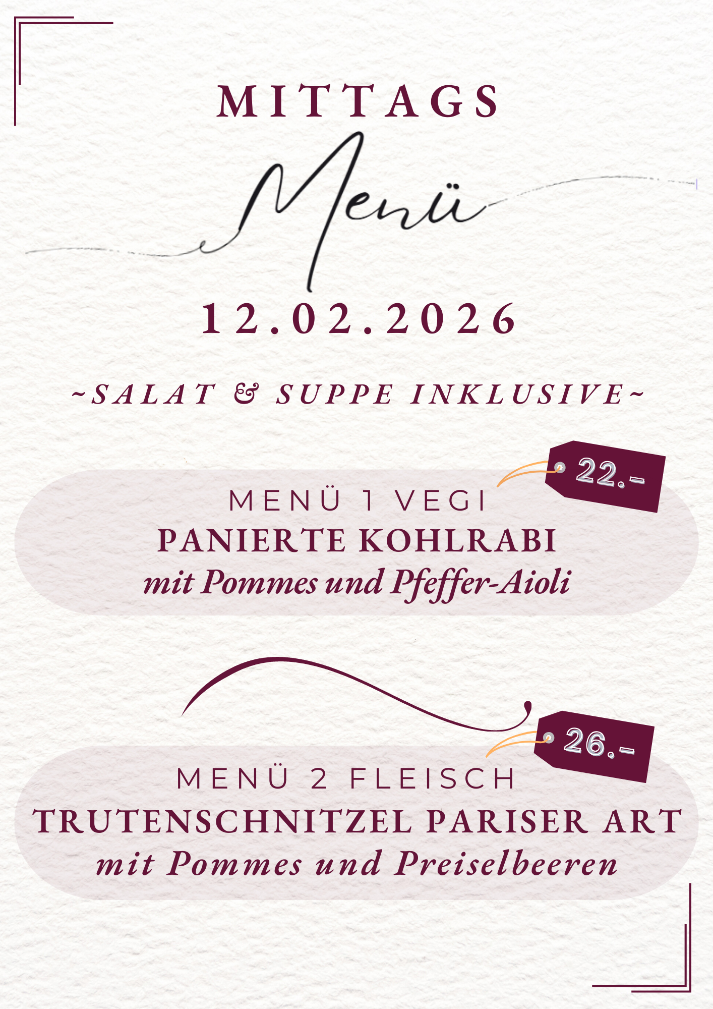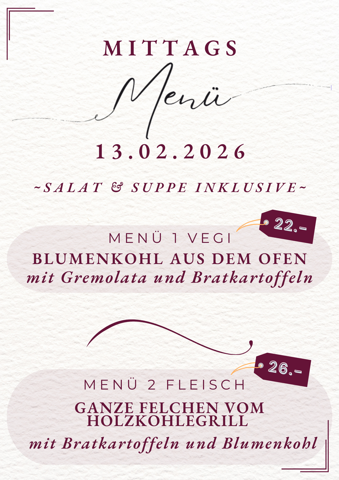 Mittagsmenü 9., 12., 13. Februar 2026