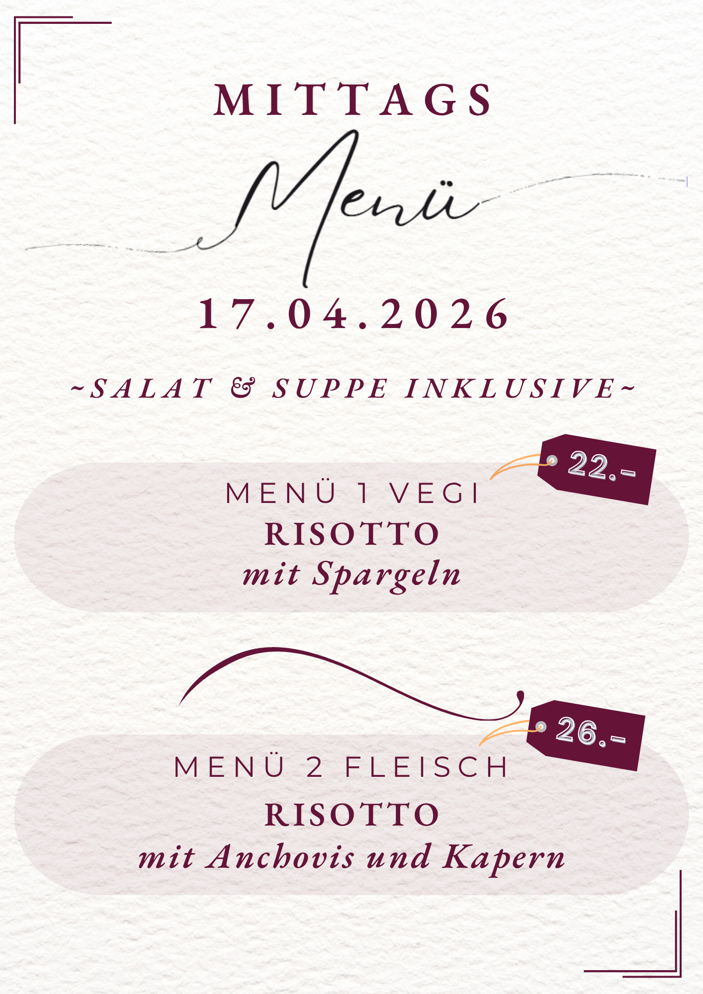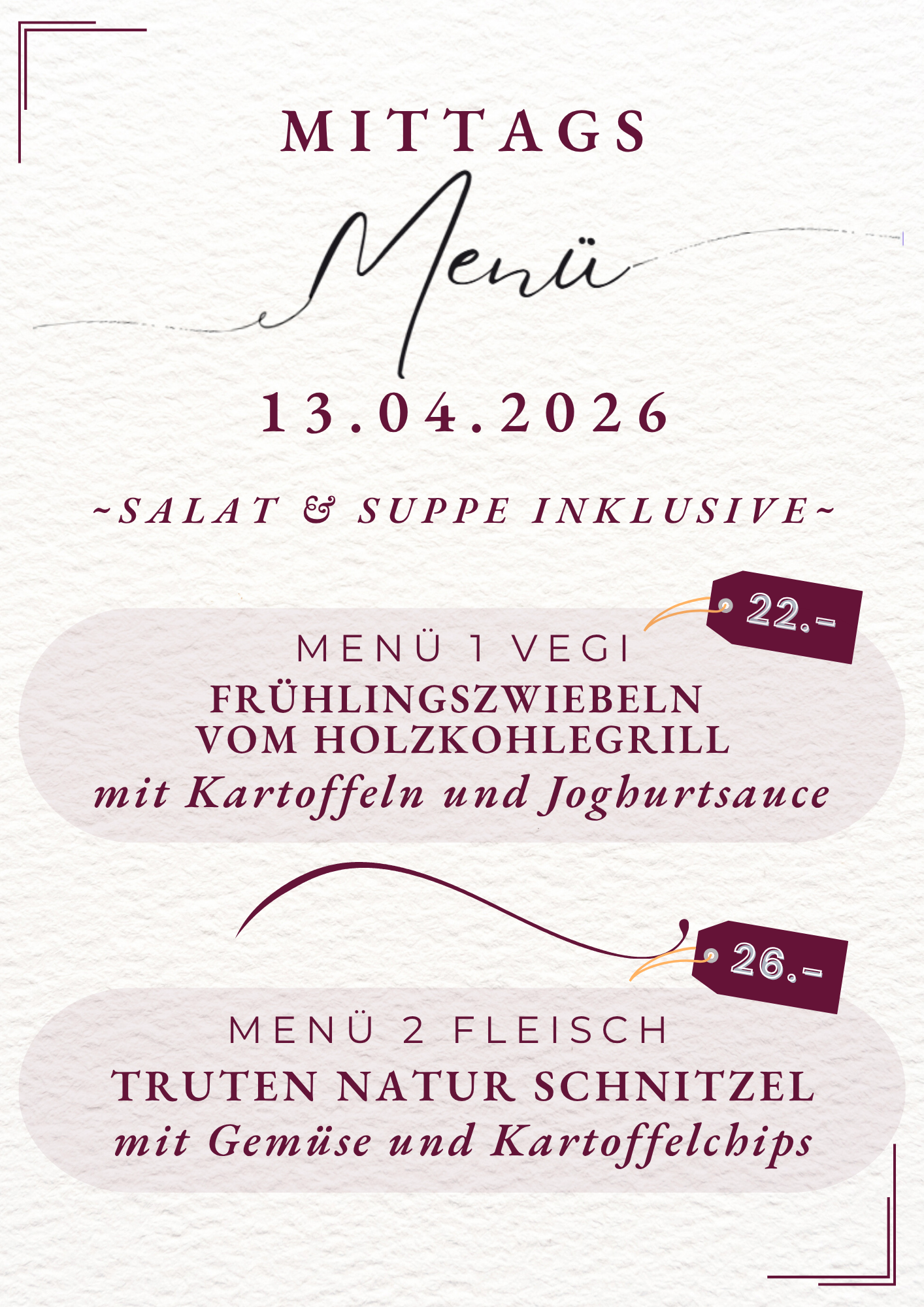 Mittagsmenüs 13., 16., 17. April 2026